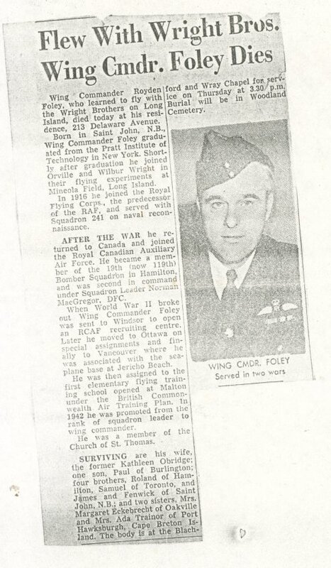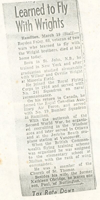 On May 11, 1917, Foley enlisted in the Royal Flying Corps (R.F.C), the predecessor of the Royal Air Force (R.A.F). He began his cadet pilot program at the Beamsville Camp in Ontario, where he was trained on the Curtiss JN4-A “Jenny,” a twin-seat dual control biplane. Foley completed his time at the R.F.C and was discharged on January 4th, 1918. He was stationed at No. 241 Squadron in England. He conducted maritime patrols, provided convoy support, and conducted naval reconnaissance in the North Sea against German U-Boats. Foley's total wartime flight time was 360 hours. After the War ended, while stationed in England, Foley met Minna Kathleen Owbridge and married her in 1919. Foley continued his patrolling duties until 3rd May 1919, as a Second Lieutenant in the R.A.F. 251 Squadron. Foley was granted an honourable discharge with the rank of lieutenant in 1920. Foley returned to Canada , and he worked for the Ford Motor Company in his hometown of St. John's, NB, until 1925. Foley then moved to Hamilton, Ontario, where he joined the Royal Canadian Auxiliary Air Force and became a member of the 19th (now 119th) Bomber Squadron.