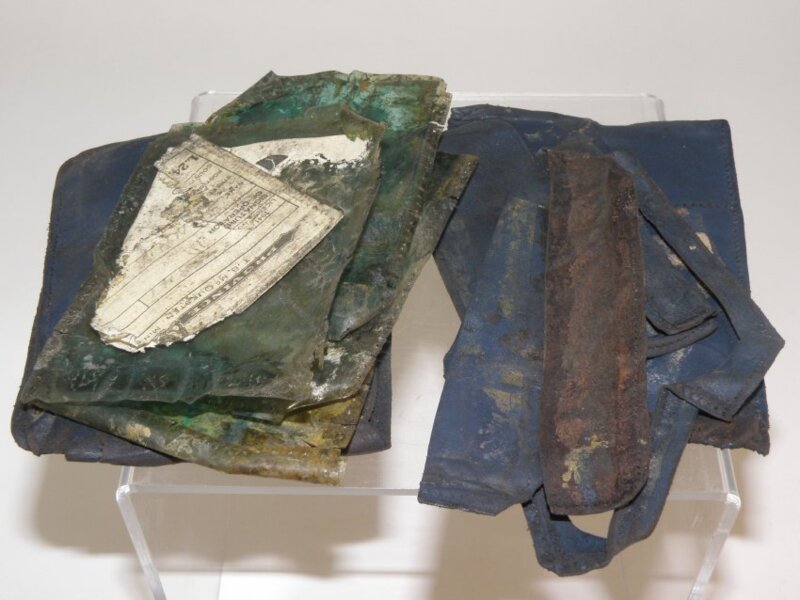 Wallet belonging to Dennis Haig Kurtz from Burlington, On. Killed in action Aug. 1/42 age 21. #16 Operational Training Unit. Wellington aircraft was shot down at Eindhoven. Flight Sergeant Observer Kurtz is buried in the Woensel General Cemetery, Eindhover, North Brabant, Holland. Wallet forwarded to family of Dennis Kurtz by Bernard Ploegmakers