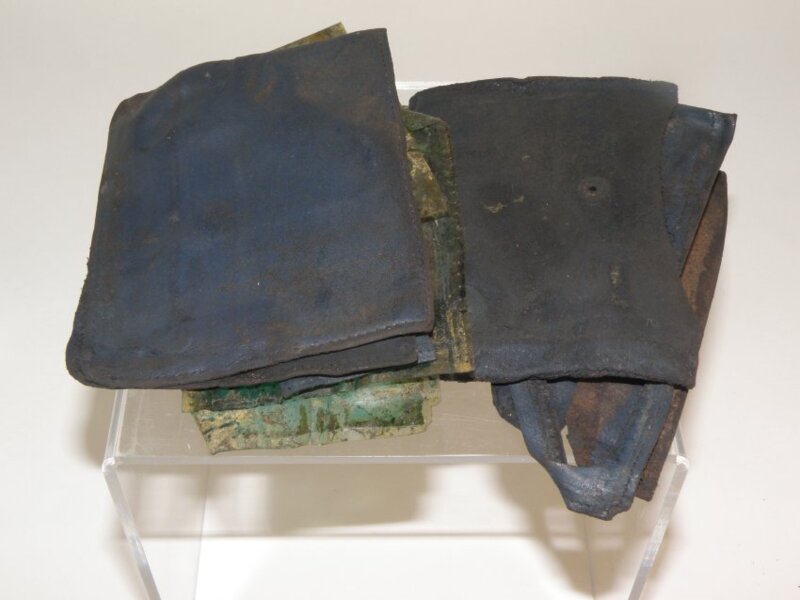 Torn and badly damaged parts of wallet. Appears to have been made of black leather with four plastic pockets which are discoloured green and rust brown. Contains badly damaged portion of driver's license (only last 3 digits (841) legible). Portion of "Membership Card" visible in one of the plastic pockets. Also contained 3 coins and a button; please see 115.113.006/7 for details. See also 015.112.xxx related to Dennis Kurtz