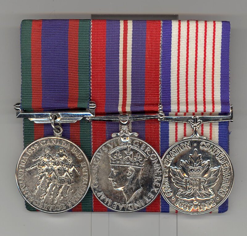 Three Medals with ribbons mounted together on board, from left to right: 1) Canadian Volunteer Service Medal 1939 to 1945 2) War Medal 1939 to 1945 3) 125th Anniversary of the Confederation of Canada Medal (1992)