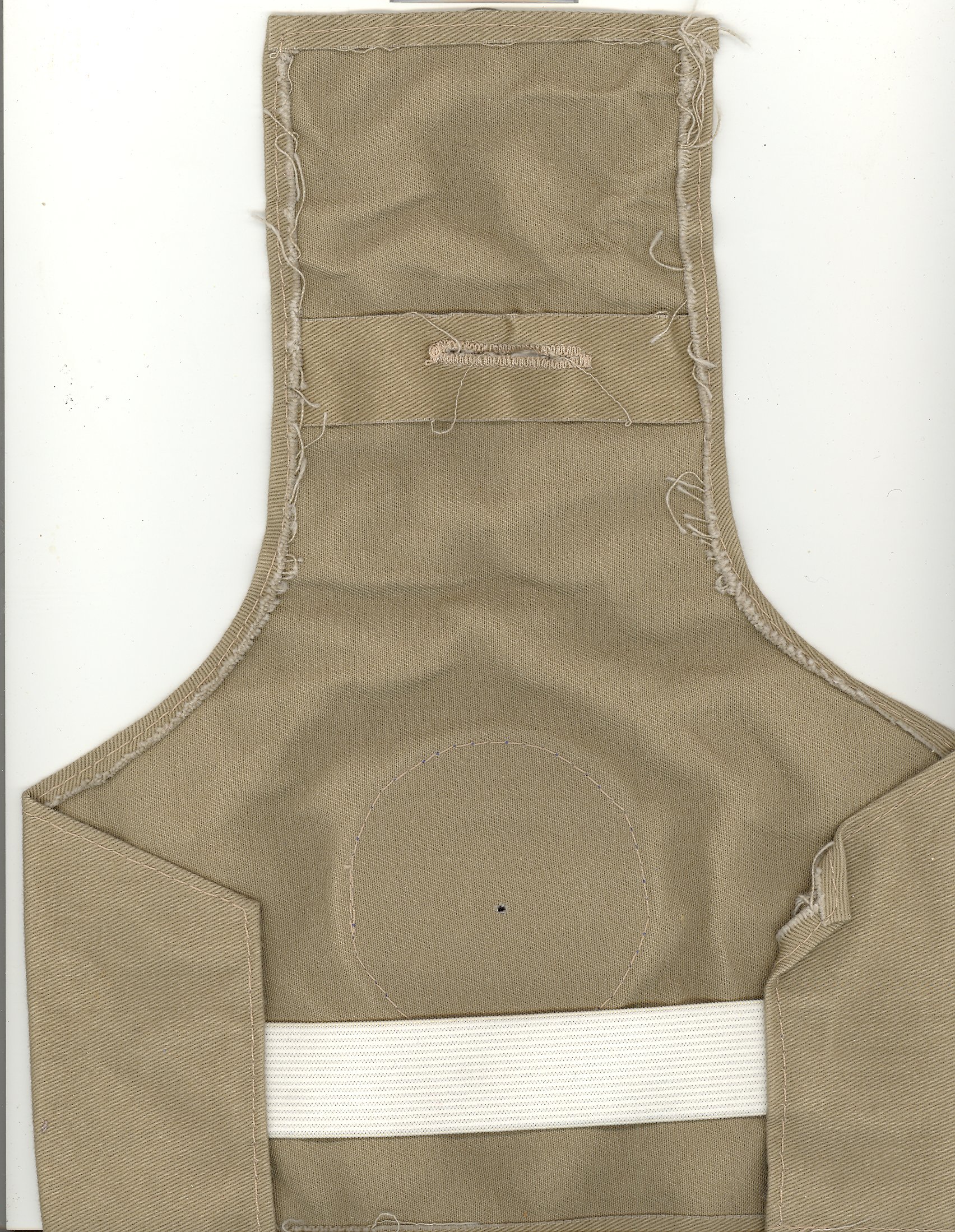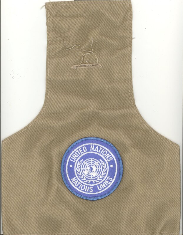 A small United Nations head cap with United Nations badge in English and French on front. Back has elastic band for fitting, and top folds over with button hole. Perhaps was a type of helmet cover to identify as U.N.