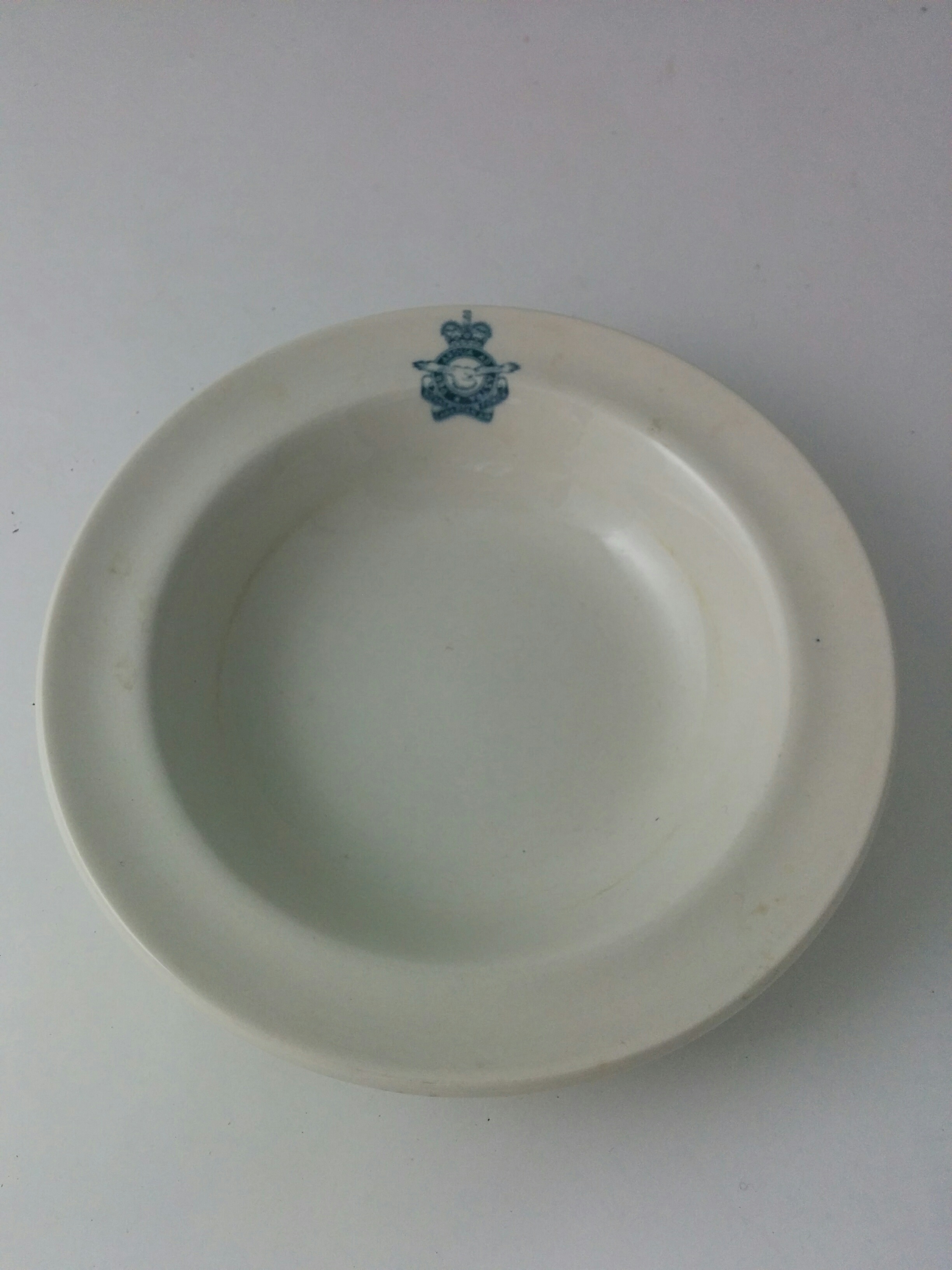 A bowl with the R.C.A.F. insignia and logo printed in rim.
