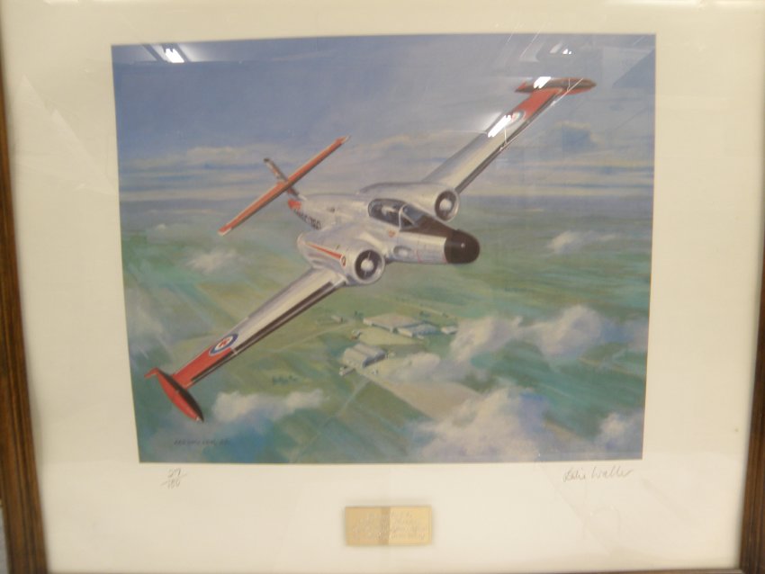 Framed print (27/100) of a RCAF CF-100 by Les Walker (signed). Plaque on frame reads "presented to Capt Ted Morris project pubic affairs officer by 1 air reserve wing"