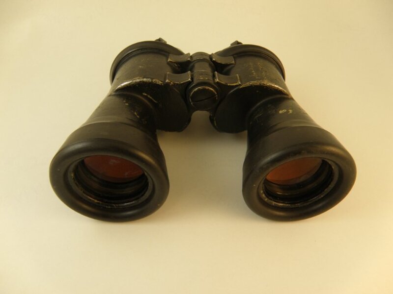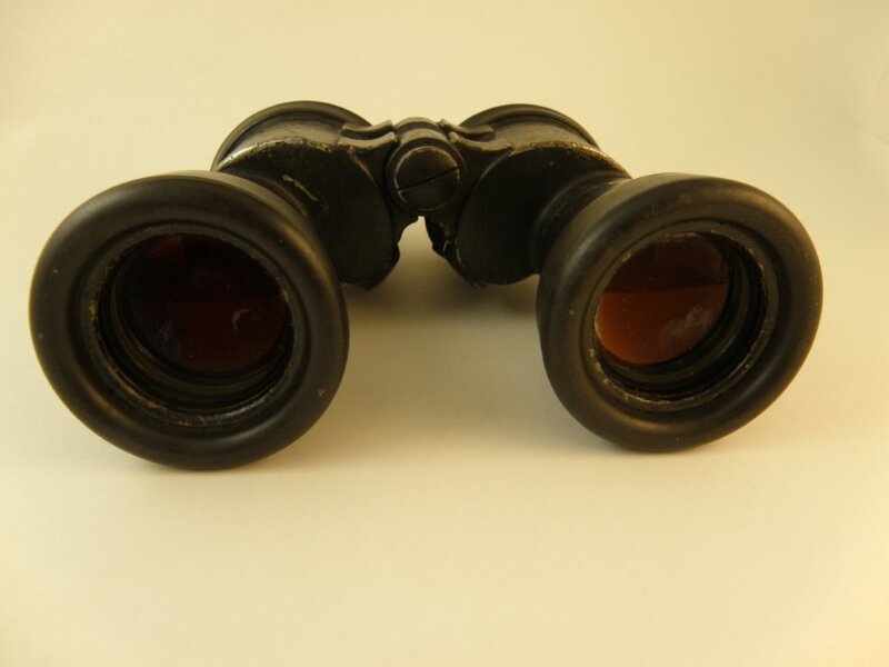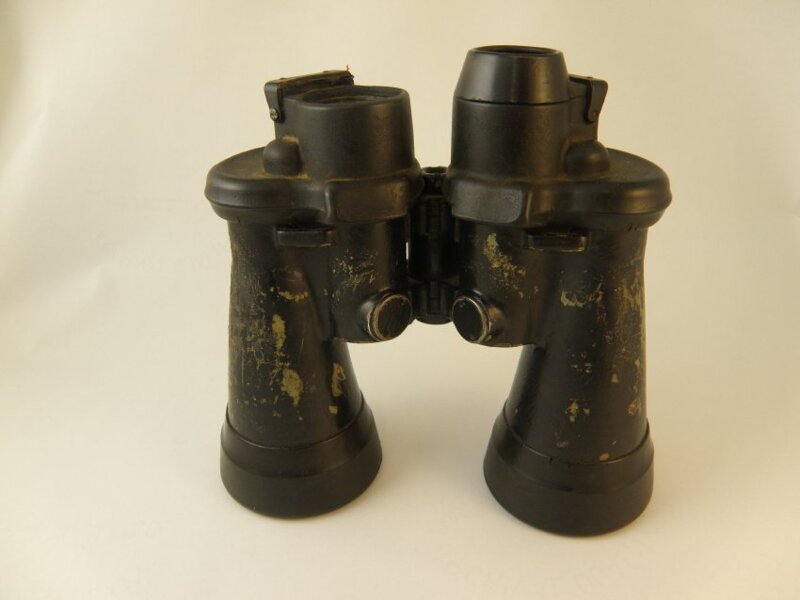 black binoculars used in the RCAF by Allan Edward Milne. Binoculars are missing an eye cover over one of the lenses. Use and wear are evident on each handle