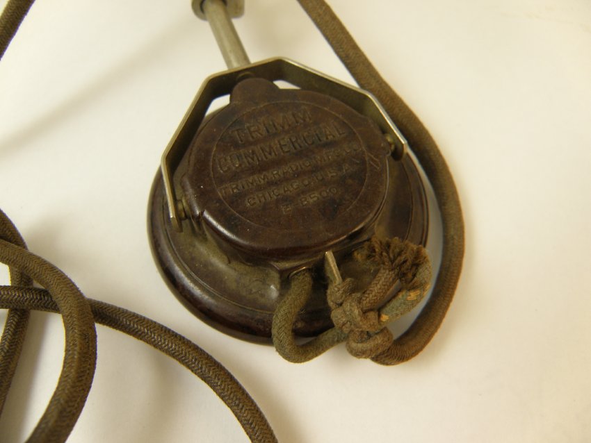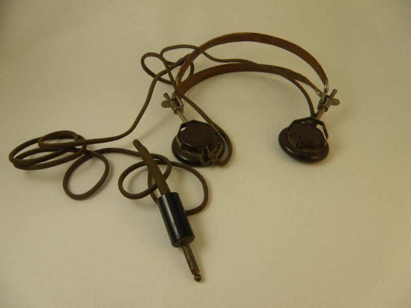 a headset with leather headband and bakelite ear phones wire with plug still attached and in good condition