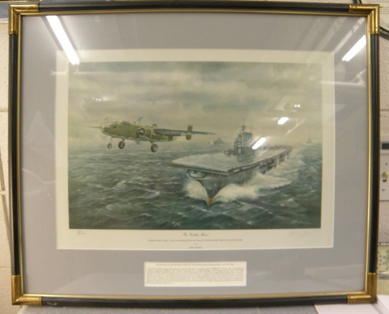 framed print by Jeffrey Pritchard titled "The Doolittle Mission" image shows Doolittle leaving Hornet on the first bombing mission over Tokyo. Limited edition of 5000 430/ 5000 signed by artist in lower right corner