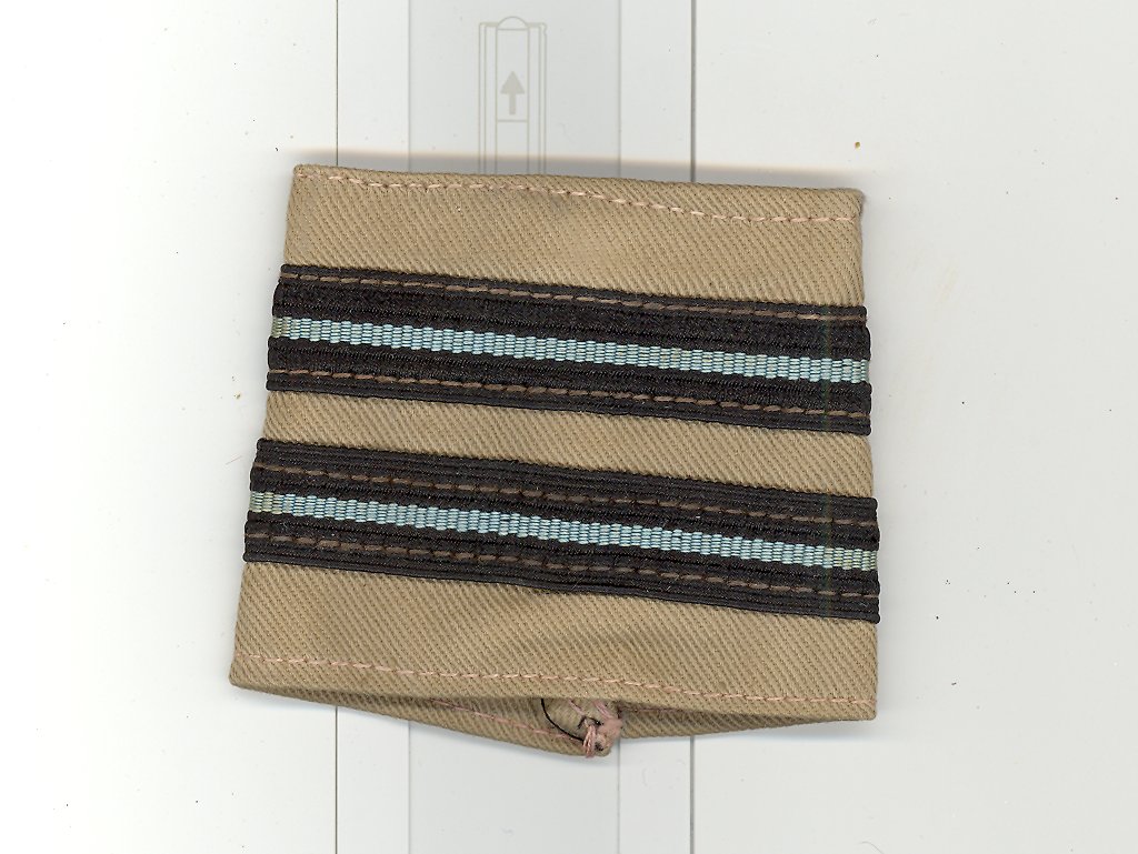 Flight Lieutenant Rank Slide for shoulder straps of RCAF Khaki Drill Uniform. Belonged to Flight Lieutenant Thomas Gordon Harbottle who flew Cranes, Ansons, Tiger Moths, Hudsons, Beauforts and Vickers Warwicks. Black and pale blue stripes on khaki fabric. Slide has been sewn together and velcro glued to back for previous display purposes.