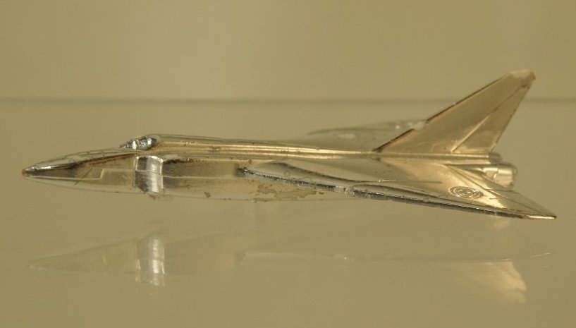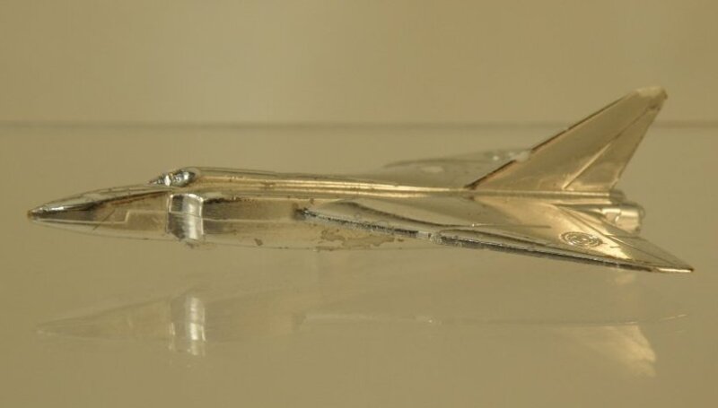 Small silver coloured replica of the Avro Arrow. The unknown donor received it from an elderly an who worker at Avro and he stresses that it was very rare. Perhaps something Avro produced as a promotional item.