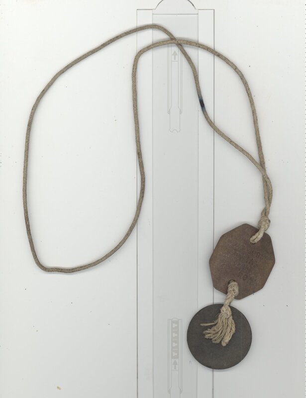 Seat of leather dog tags; one round, one octagonal joined by knotted rope/string. Inscription reads: CAN R80952, Airman M J Leger, RCAF