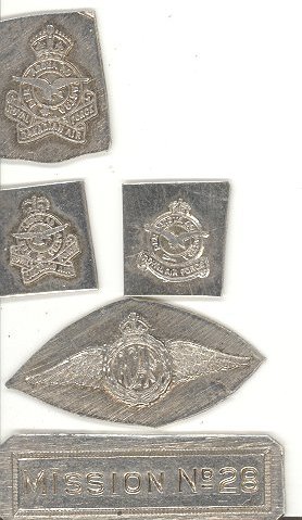 A collection of RCAF die impressions that would be trimmed and used for pins and assorted accolades. Collection includes: Two small RCAF crests One Medium RCAF crest A Mission No 28 impression A medium RCAF wings impression