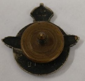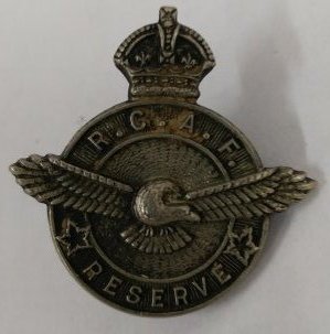 A R.C.A.F. Reserve pin which belonged to L.A.C. William Dzugalo of the R.C.A.F. Kings Crown atop a round body with the RCAF eagle with spread wings. To the top is inscribed "R.C.A.F." while to the bottom is "Reserve." On the reverse is a screw post with cap along with the manufacture name "Birks." D.M.W. PAT 1858686