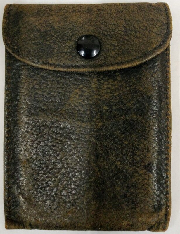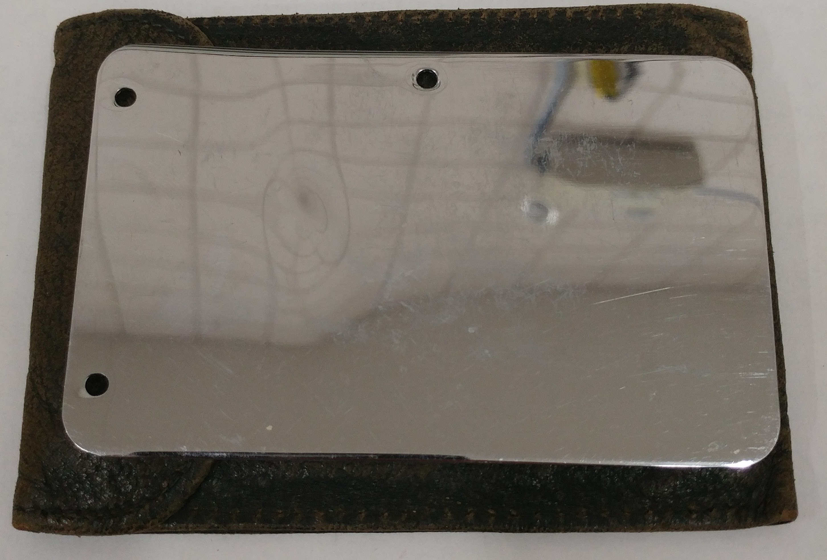A button clasp, brown leather satchel with a signal mirror used by Ground Observers, which belonged to James Stewart McLaren of the R.C.A.F.