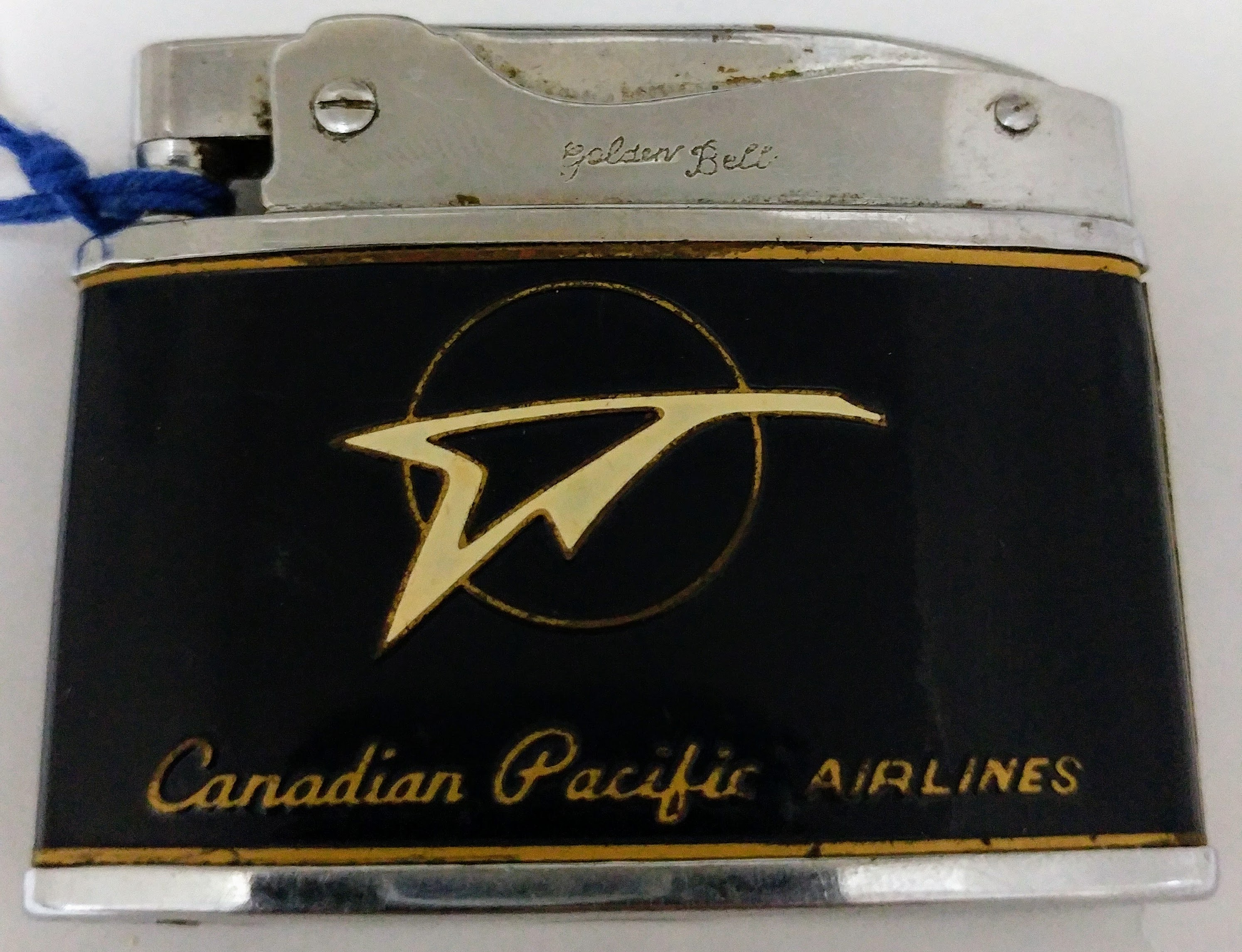 A Golden Bell Automatic Lighter bearing the name and logo of Canadian Pacific Airlines. In the early 1940s, the Canadian Pacific Railway Company purchased ten bush airlines in a short time span, finishing with the purchase of Canadian Airways in 1942, to form Canadian Pacific Air Lines. Early management were largely bush flying pioneers, including president Grant McConachie, superintendent Punch Dickins, and Wop May, who would become a repair depot manager in Calgary. In 1968, Canadian Pacific Air Lines was rebranded as CP Air. The Canadian Pacific Railway Company (renamed Canadian Pacific Limited in 1971) had decided to align the airline's name and "Multimark" design to that of its other subsidiaries, including CP Hotels, CP Ships, and CP Transport (CP Rail was spun off from the parent company later) Source: Wikipedia