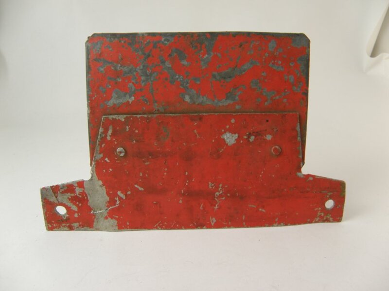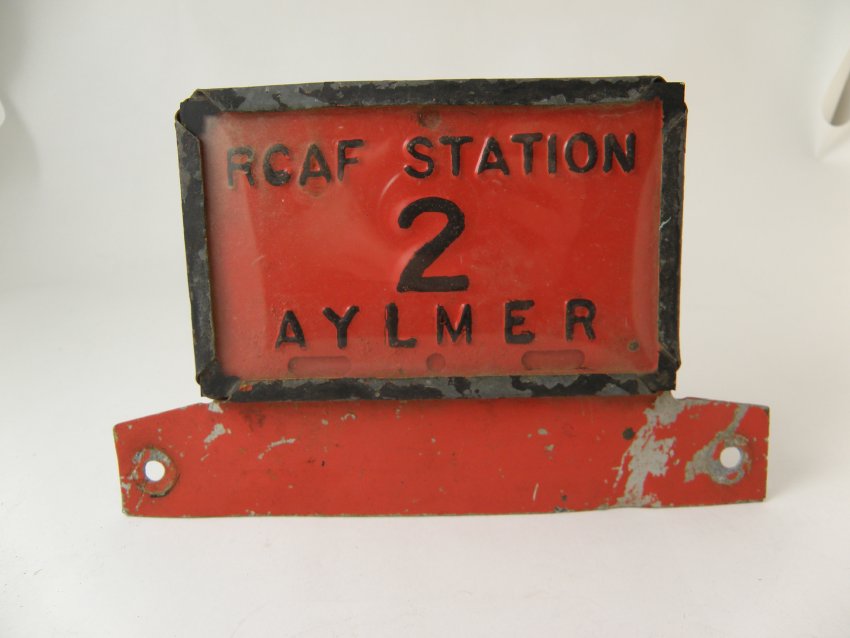 Metal licence plate; painted red; rectanglur with '"arms" out the bottom; on front reads 'RCAF STATION 2 AYLMER'; lettering painted black; black frame around lettering with plastic cover; arms have a hole in each end for possible bolt/screw; paint loss on arms and back of plate Possibly from emergency vehicle (fire truck?)