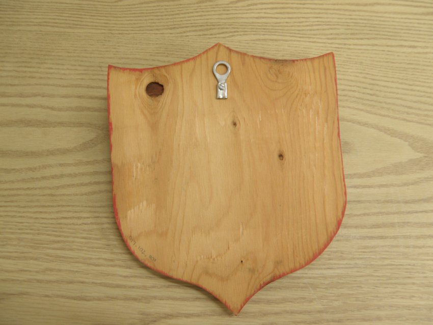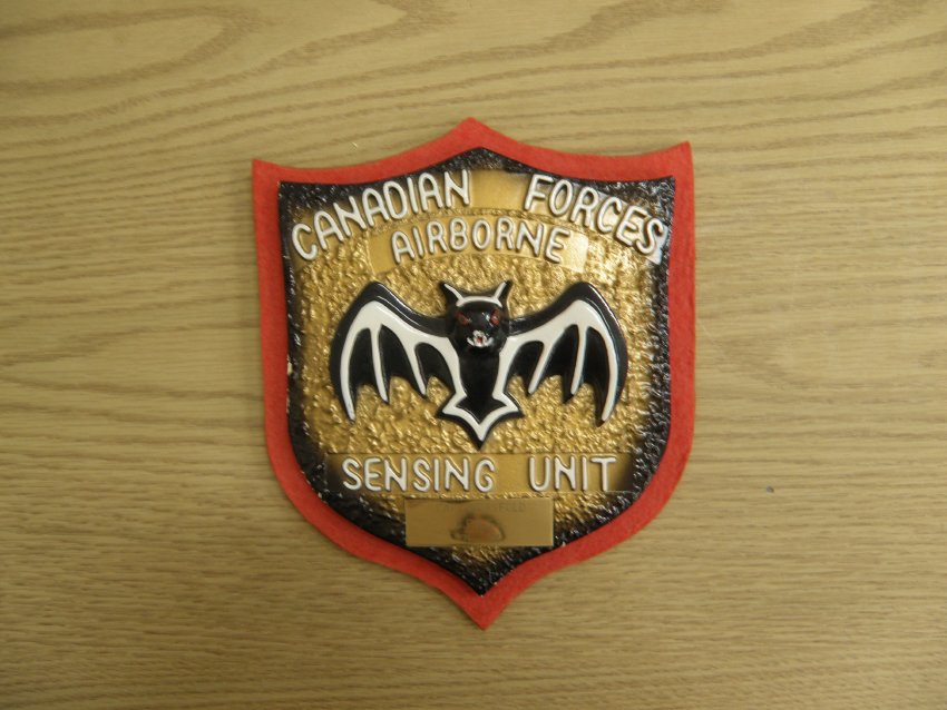 Shield shape wooden plauque; red velvet backing with plaque on top; plaque is gold with black border; in the middle is the front profile of a black bat; above reads in white 'CANADIAN FORCES AIRBORNE'; below the bat in white reads 'SENSING UNIT'; under the writing is a small rectangular brass plaque that reads 'CAPT. WORSFOLD C.F.A.S.U. 71-71'