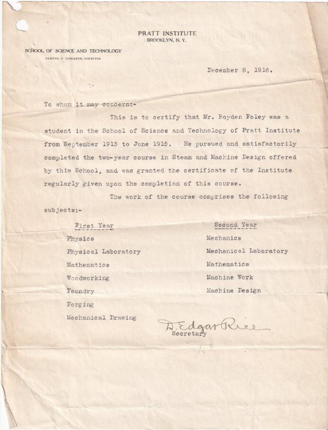 This is to certify that Mr. Royden Foley was a student in the School of Science and Technology of Pratt Institute from September 1913 to June 1915. He pursued and satisfactorily completed the two-year course in Steam and Machine Design offered by this School, and was granted the certificate of the Institute regularly given upon the completion of this course.