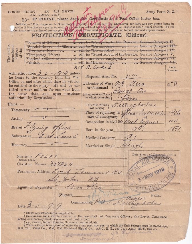 with effect from 3-5-1919 unless he hears to the contrary from the War Office, on and after which date he will not be entitled to draw pay. He will be entitled to wear uniform for one week from the above date and upon occasions authrotized by Regulations.