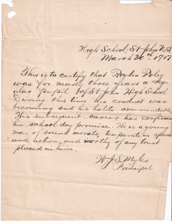 This is to certify that Royden Foley was for nearly three years a regular pupil of St John High School. During this time his conduct was becoming and his habits commendable. His subsequent career has confirmed his school day promise. He is a young man of sound morals, temperate in speech and action, and worthy of any trust placed in him.
