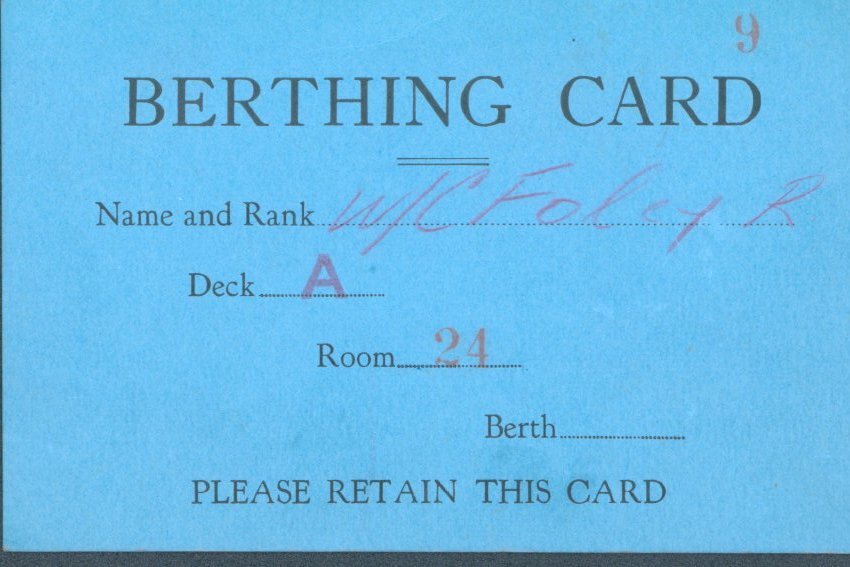 The blue paper document is a “berthing card” provided to personnel to identify their assigned sleeping accommodation. On this card, top name and rank: Wing Commander (W/C) Foley R. Assigned to deck A, room 24.
