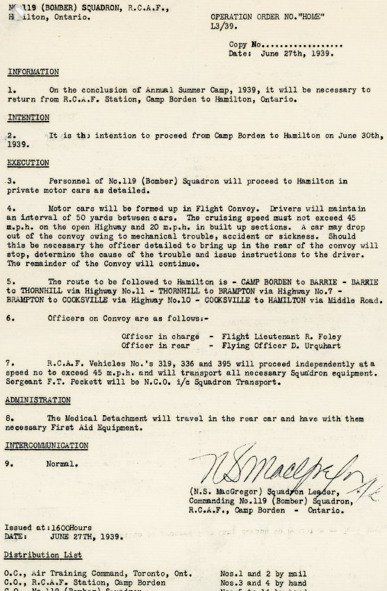 This is a letter regarding an operation order called NO. "Home" L3/39. The operation was from an informative C.O., No.119 (Bomber) Squadron N.S. MacGregor, R.C.A.F. This letter was distributed because of the conclusion of the Annual Summer Camp, 1939, so that those partaking could return from the R.C.A.F. Station, Camp Borden, to Hamilton, ON. The execution of this plan was to return to Hamilton on June 30, 1939. The squadron wrote detailed directions and steps to follow to participate in this journey in a sound manner. Officers in the convoy are listed as Officer in charge: Flight Lieutenant R. Foley and Officer in rear: Flying Officer D. Urquhart. Medics are anticipated to be present in this letter in case first aid/equipment is needed during this convoy. The letter was issued at 1600 hours.