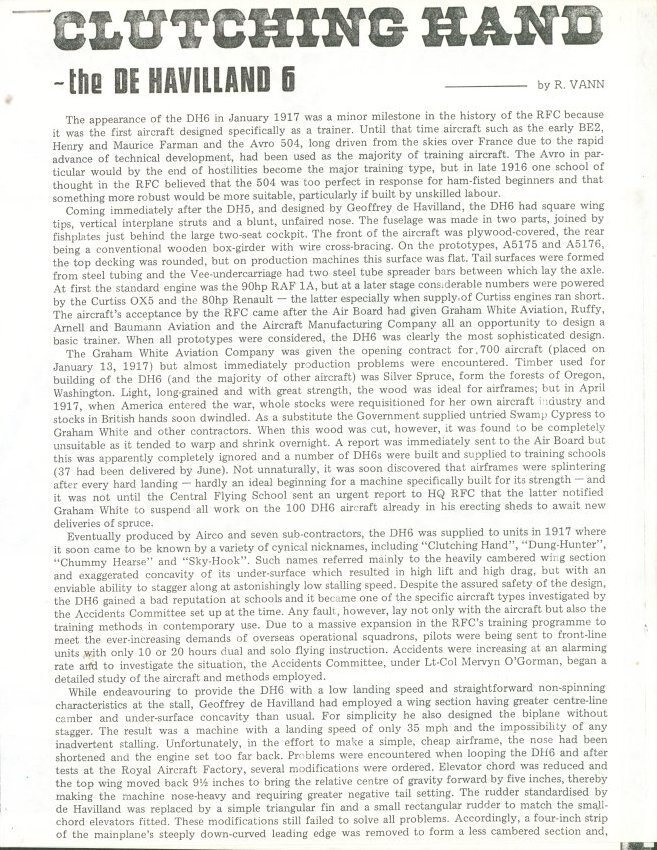 “Clutching Hand: The De Havilland 6,” authored by R. Vann, offers a comprehensive overview of the De Havilland 6 (DH6), a British Royal Air Force training aircraft. The article examines the aircraft’s origins, design features, and material construction. The publication spans ten pages and includes a series of thirteen photographs of the DH6.