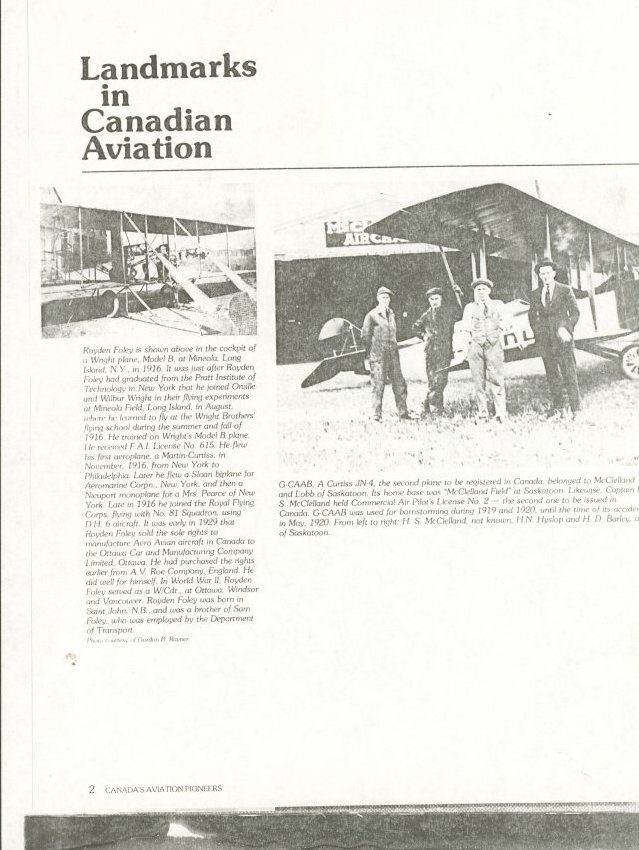 The article is listed in “Landmarks in Canadian Aviation”. The article features two black-and-white pictures. The first picture on the top left is Royden Foley himself, working for the Wright Brothers, circa 1916, in N.Y., U.S.A. With Royden in the cockpit of the Plane. The article below the picture is a biography of Royden Foley's aviation career. The second black-and-white photo on the right shows four gentlemen in front of a G-CAAB Plane. From left to right are H.S. McClelland, Unknown, H.N Hyslop, H.D Barley