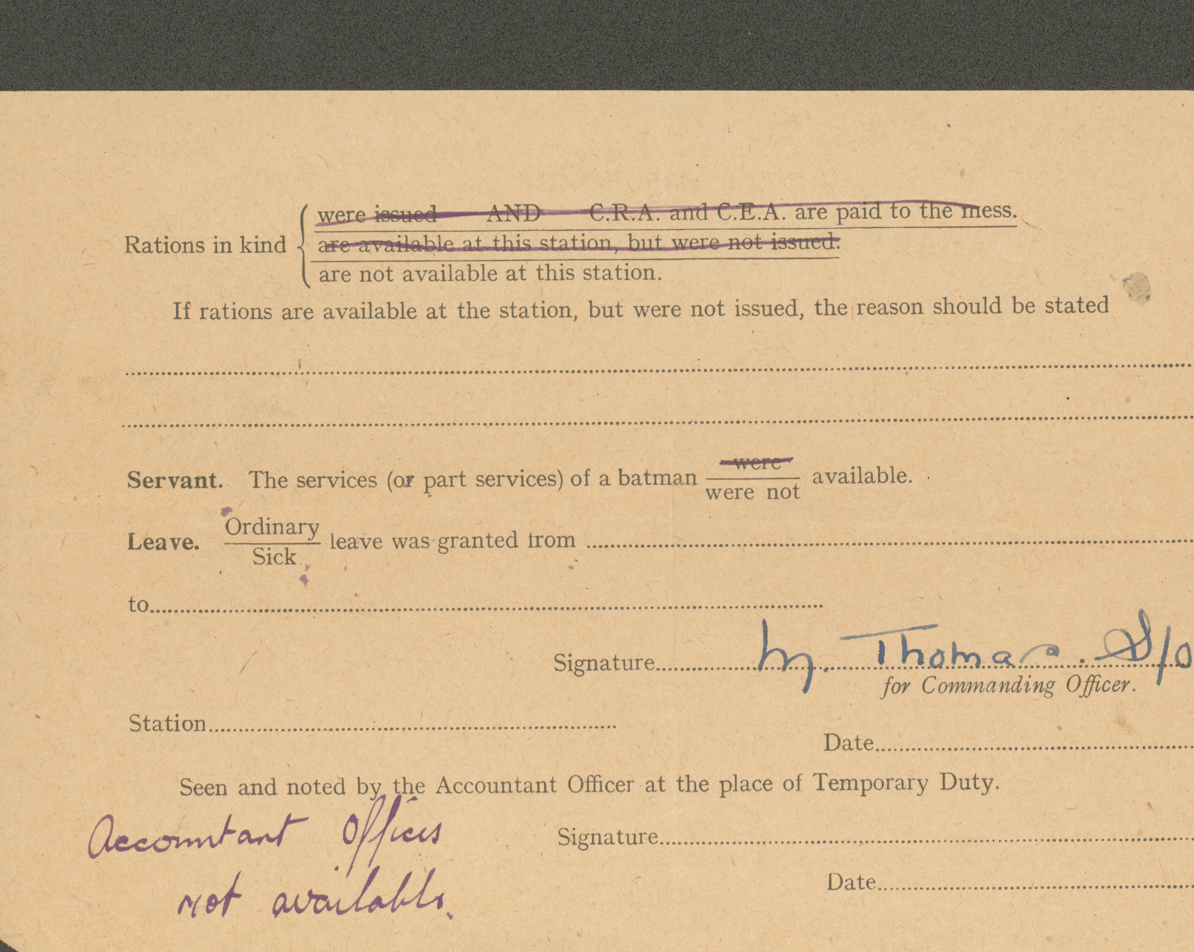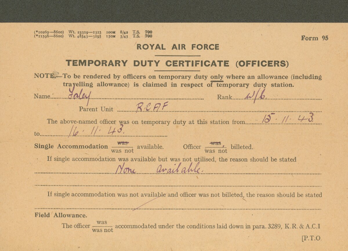 This is a temporary duty certificate from the Royal Air Force. Within the sheet it lists things like options for billiting as well as rations and allowance. Throughout this sheet it looks like all of the accomodations/support was not available at the time.