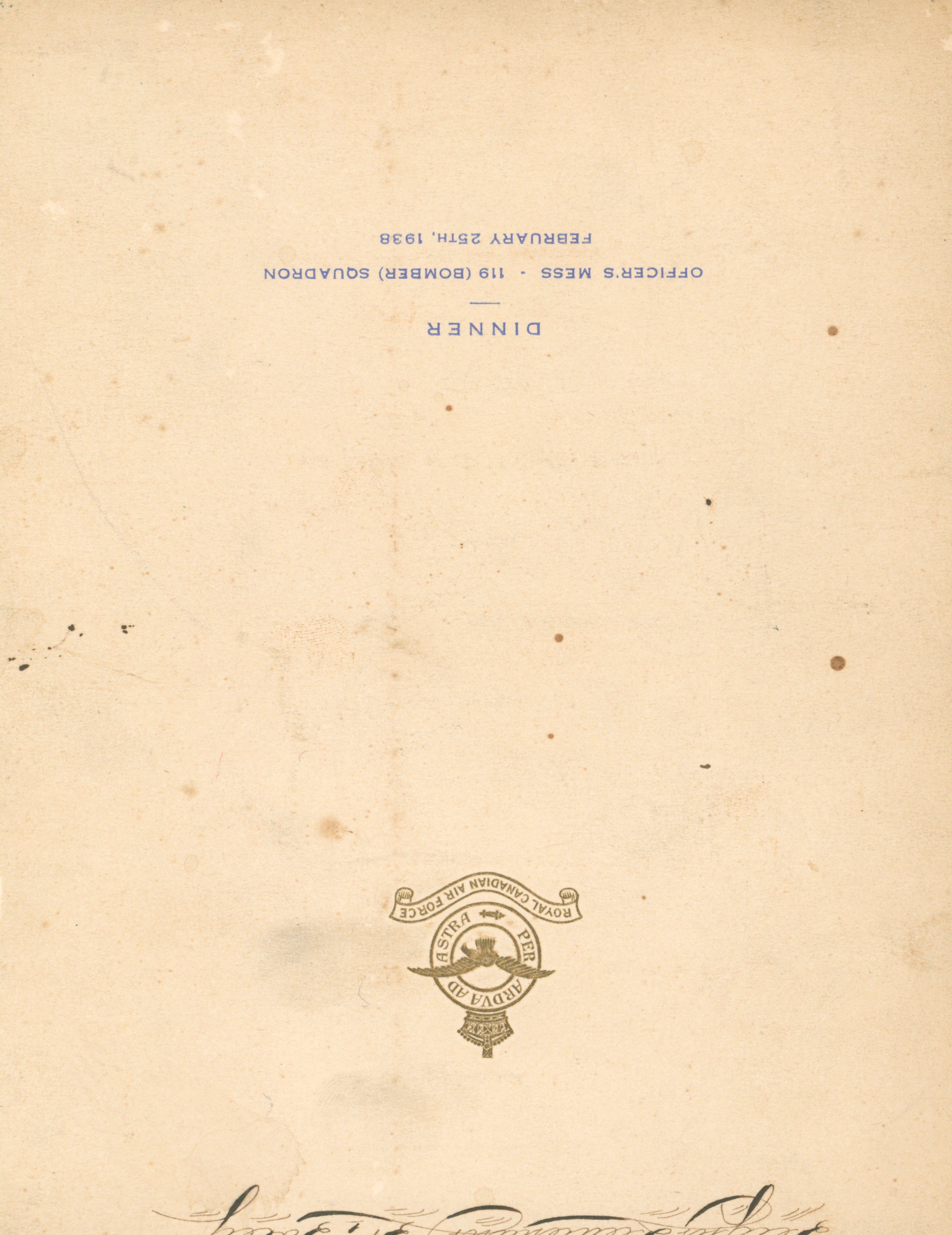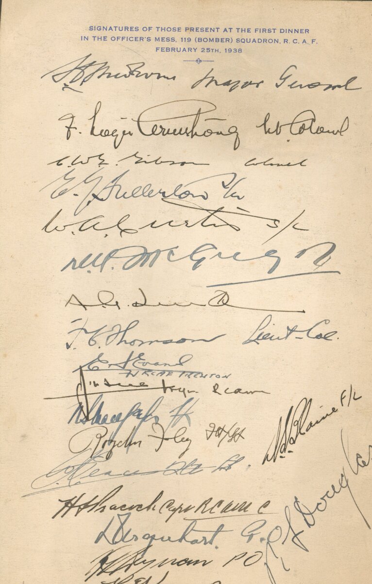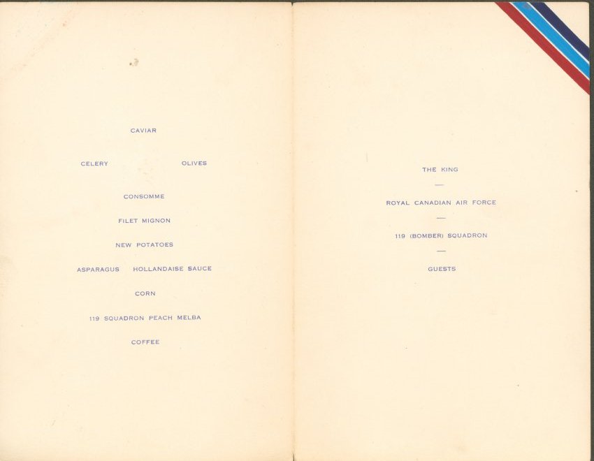 This seems to be a menu/pamphelet in regards to an Officers Mess Dinner in association with Royden Foley and the R.C.A.F. This dinner was held for the 119 Bomber Squadron. The options for food and drink include, caviar, celery, olives, filet mignon, potatoes, asparagus, hollandaise sauce, corn, peach melba, and coffee. On the very back there are signatures of those who attended the dinner.