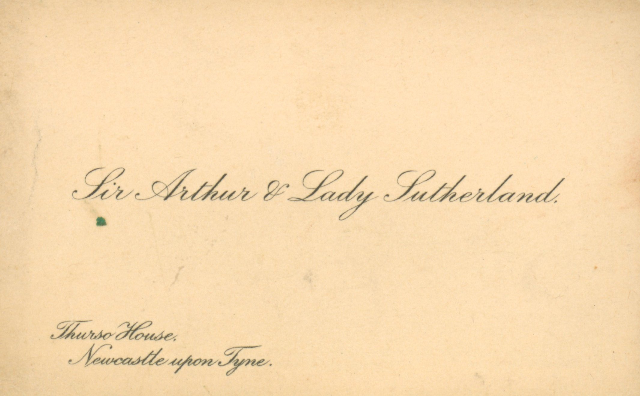 This is a small slip that states Sir Arthur and Lady Sutherland in the middle. The bottom corner says Thurso House, Newcastle upon Tyme. I am assuming this is an invite for something, however there is no specifics just names and a place.