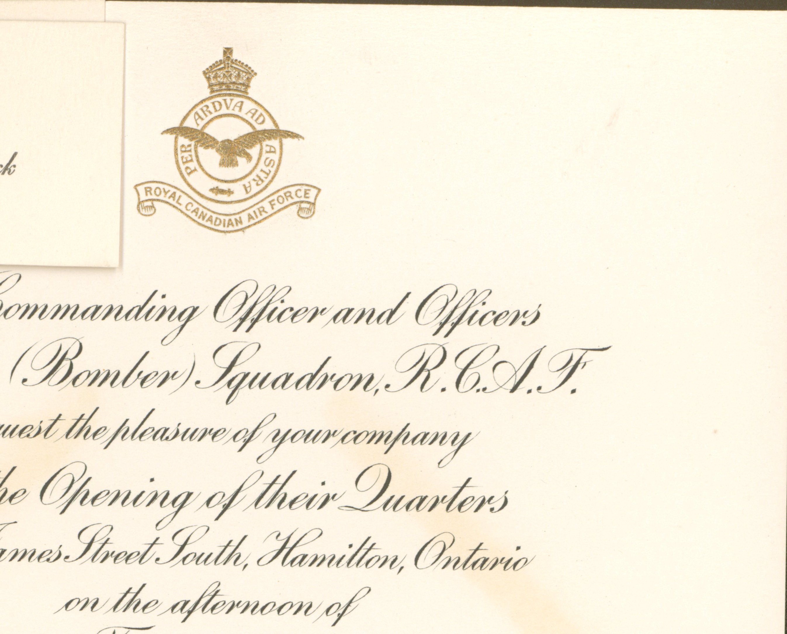 This is a personal invitation from the R.C.A.F to commanding officers a part of the 119 (Bomber) Squadron to come to the opening of the quarters at 275 James st South, Hamilon ON. The letter tells them to RSVP to the secretary at the officers mess. There is a clip in the top left corner that states at blank O'clock (no time specified). This letter still came in its original envelope-it it is blank.