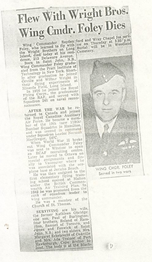 Wing Commander . Royden Foley, who learned to fly with the Wright Brothers on Long Island, died today at his residence, 213 Delaware Avenue. Born in Saint John, N.B., Wing Commander Foley graduated from the Pratt Institute of Technology in New York. Shortly after graduation, he joined. Orville and Wilbur Wright in their flying experiments at Mineola Field, Long Island . In 1916, he joined the Royal Flying Corps, the predecessor of the RAF, and served withSquadron 241 on naval reconnaissance. AFTER THE WAR, he returned to Canada and joined the Royal Canadian Auxiliary Air Force. He became a member of the 19th (now 119th) Bomber Squadron in Hamilton and was second in command under Squadron Leader Norman MacGregor, DFC. When World War II broke out, Wing Commander Foley was sent to Windsor to open an RCAFrecruiting centre. Later, he moved to Ottawa on special assignments and finally to Vancouver, where he was associated with the seaplane base at Jericho Beach. He was then assigned to the first elementary flying training school opened at Malton under the British Commonwealth. Air Training Plan. In 1942, he was promoted from the rank of squadron leader to wing commander. He was a member of the Church of St. Thomas. Surviving are his wife, the former Kathleen Obridge; one son, Paul of Burlington; four brothers, Roland of Hamilton, Samuel of Toronto, and James and Fenwick of Saint John, N.B.; and two sisters, Mrs. Margaret Eckebrecht of Oakville and Mrs. Ada Trainor of Port Hawksburgh, Cape Breton Island. The body is at the Blach-Ford, and Wray Chapel for service on Thursday at 3:30 p.m. Burial will be in Woodland Cemetery.